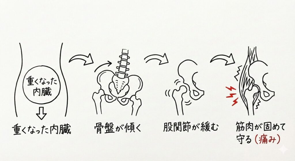 胃腸や肝臓などの臓器が疲れると、内臓は重く下がり、骨盤を内側から歪ませます。その歪みが、股関節の噛み合わせをズレさせてしまうのです。