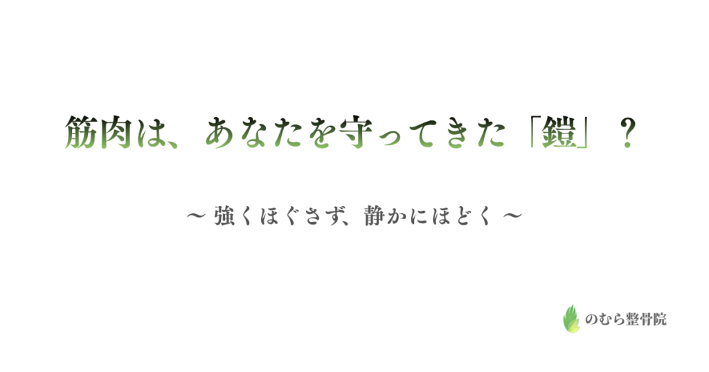 すぐ戻るコリは疲労ではなく「防御」かもしれない。筋肉は自己認識のセンサーであり、感情の記憶装置。強くほぐさず、安全の信号で鎧をほどく。 -